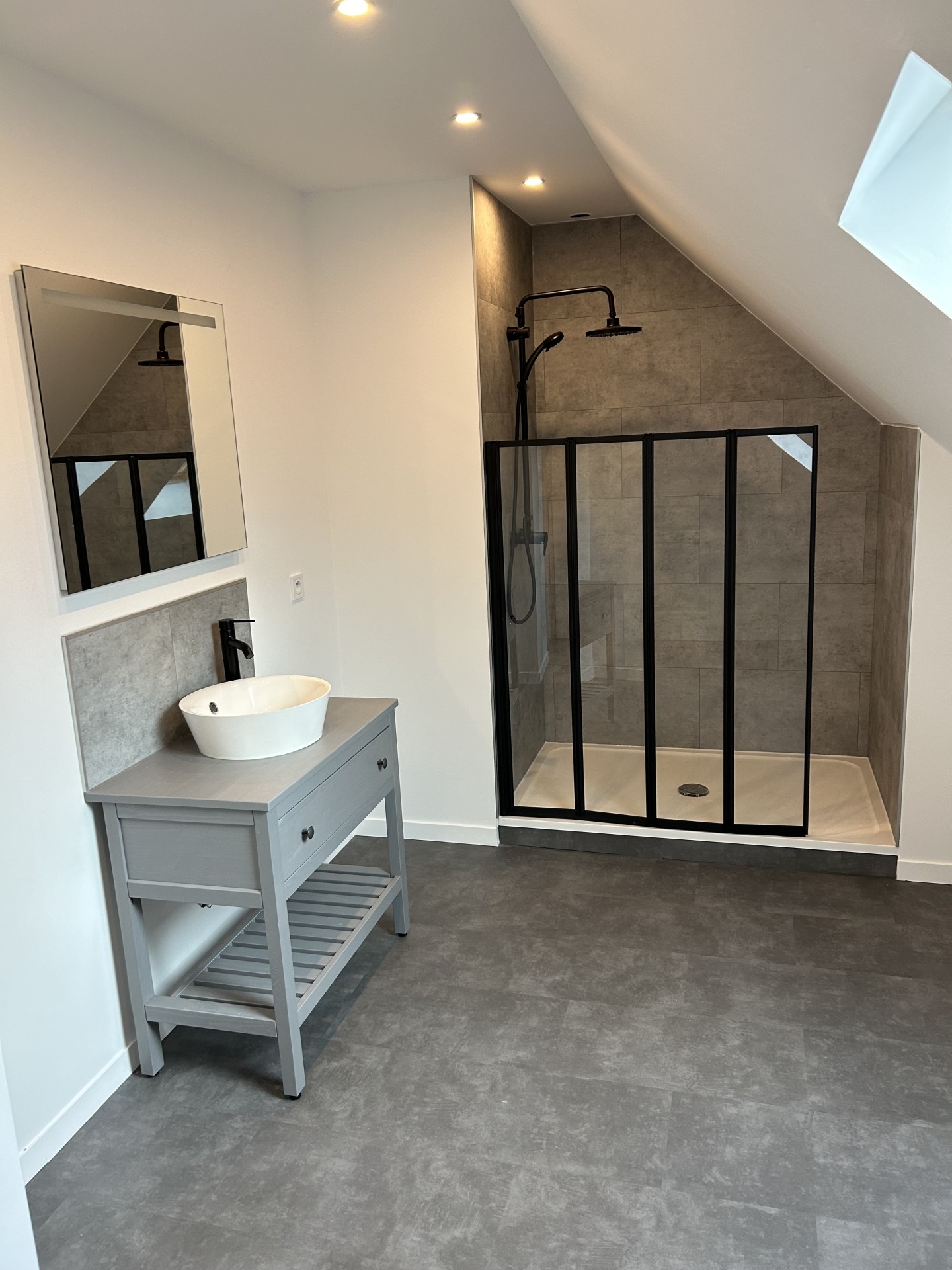 Pose dalle murale, mise en place meuble, vasque et miroir